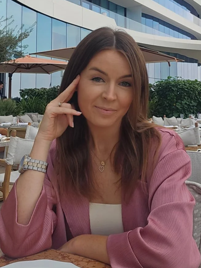 A woman with long brown hair sitting outdoors at a restaurant during daytime, wearing a pink blazer and a white top, with a modern glass building and patio umbrellas in the background.